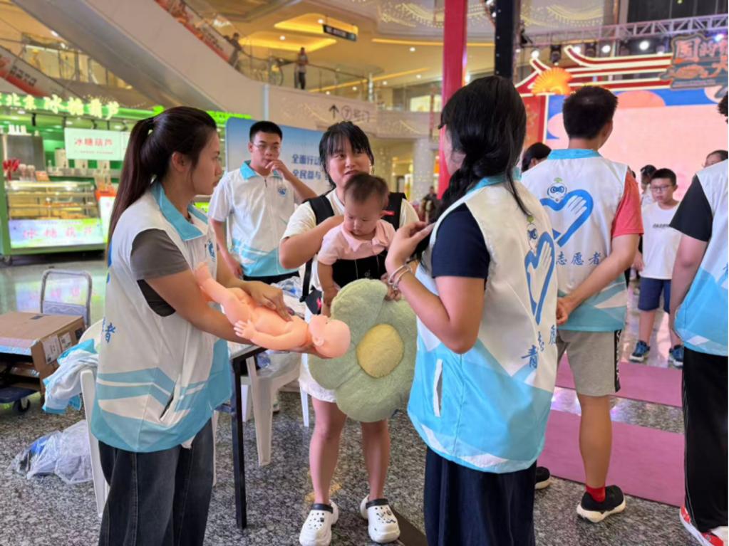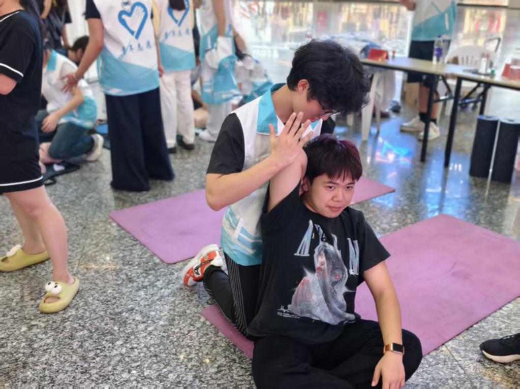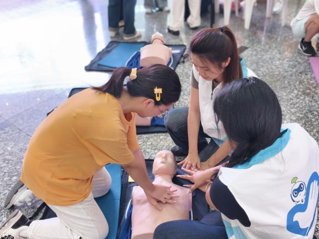 生命守護(hù)急救站里,健康管理組師生現(xiàn)場演示心肺復(fù)蘇與海姆立克急救法,市民們輪番上陣實(shí)操,志愿者手把手糾正動作細(xì)節(jié)。