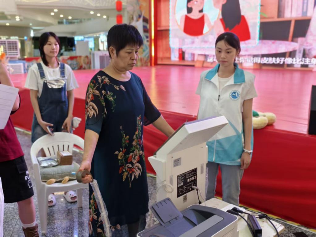 精準(zhǔn)識胖檢測區(qū),醫(yī)學(xué)營養(yǎng)組用專業(yè)設(shè)備為居民檢測體脂率、肌肉量,一對一解讀體質(zhì)報告,科普科學(xué)減重知識。