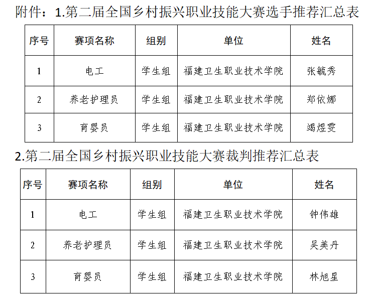 根據《福建省人力資源和社會保障廳關于做好第二屆全國鄉村振興職業技能大賽參賽報名工作的通知》要求,經二級學院推薦,繼續教育學院審核,擬推薦以下學生和老師報名第二屆全國鄉村振興職業技能大賽參賽選手和裁判員。