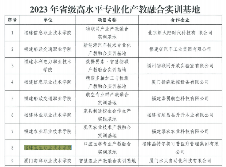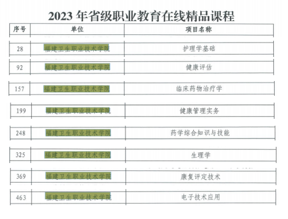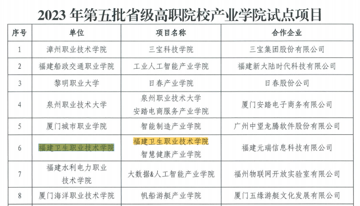 日前,福建省教育廳公布了2023年省級職業教育信息化和產教融合重點項目。我校“智慧健康產業學院”項目獲批省級第五批高職院校產業學院試點項目;“口腔醫學專業產教融合實訓基地”項目獲批省級高水平專業化產教融合實訓基地;《護理學基礎》《健康評估》《臨床藥物治療學》《健康管理實務》《藥學綜合知識與技能》《生理學》《康復評定技術》《電子技術應用》8門課程獲評省級職業教育在線精品課程;“護理專業教學資源庫”“預防醫學專業教學資源庫”2個項目列為省級職業教育專業教學資源庫;《醫學信息技術基礎》《成人護理-外科護理》《病理學與病理生理學》《經絡與腧穴》4門省級職業教育精品在線開放課程通過驗收。