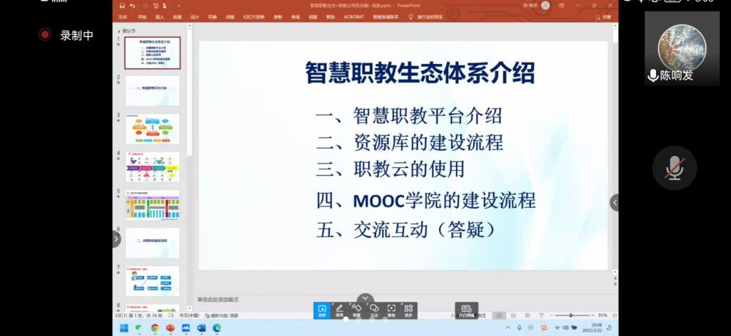為進一步落實我院雙高建設任務,深化三教改革,促進我校省級精品在線開放課程的優質建設與推廣使用,教師發展中心于2022年3月22日在線召開省級精品在線開放課程建設交流會,教務處處長魏碧娜、教師發展中心孫錦彬,各省級精品在線開放課程負責人及平臺信息員共20余人參加了本次會議,會議由教務處副處長何舒瀾主持。