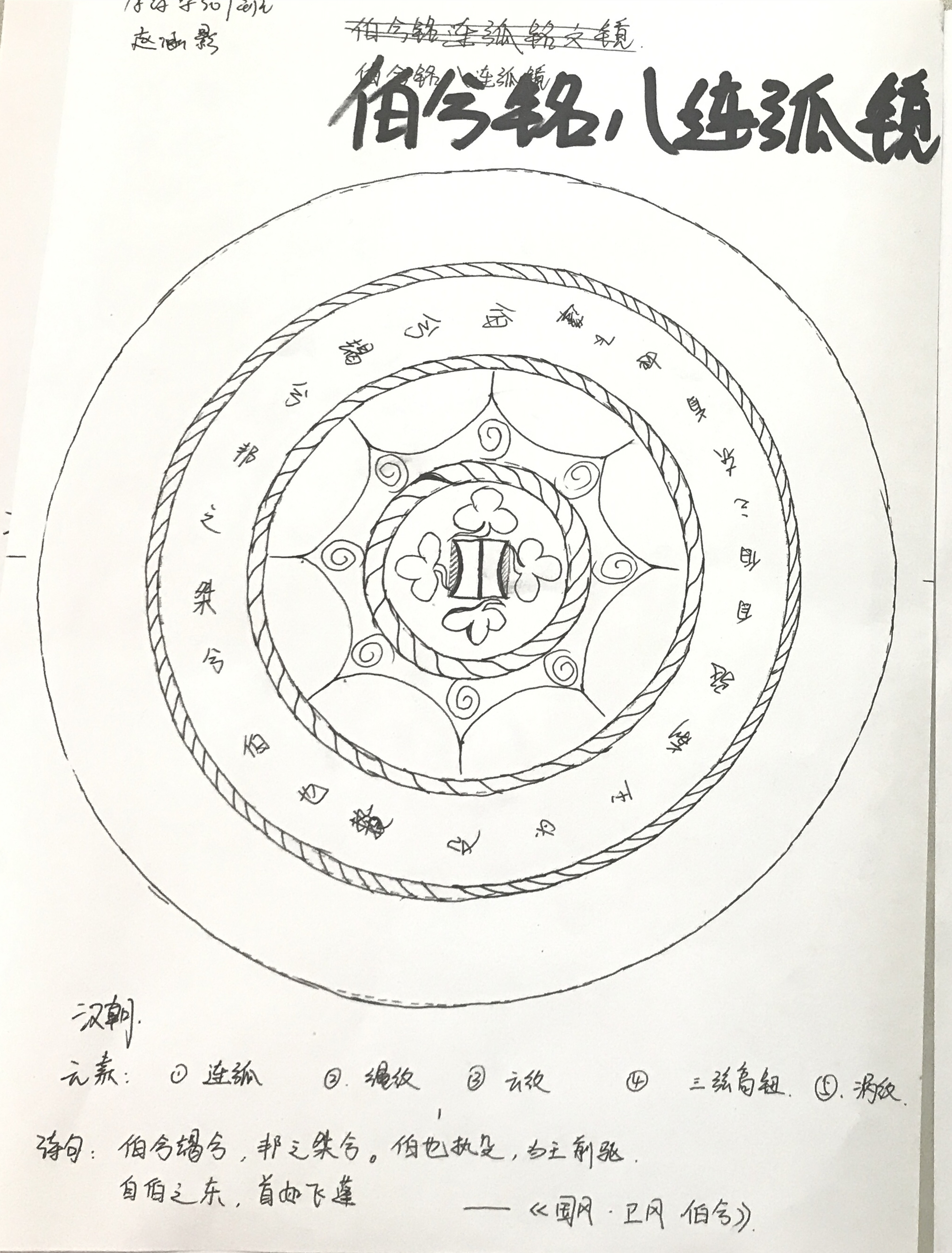 現場最優秀的手繪作品出自18藥學307趙涵影同學,她的作品不僅完全符合漢代鏡背“相思銘文”和“紋飾繁復”的特色,還將使用到的每一種鏡背元素逐一列出注釋。本次活動使讀者們增進了對古銅鏡的了解,提高了對博物館中傳統文化的向往與好奇,有利于推進校園文化建設。