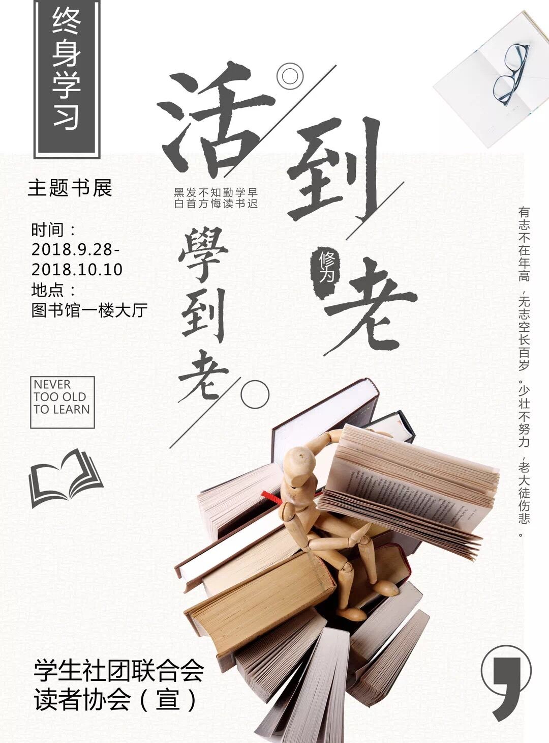 在“全民終身學(xué)習(xí)活動(dòng)周”來(lái)臨之際,圖書(shū)館特舉辦“活到老、學(xué)到老”主題書(shū)展,精選各類(lèi)好書(shū)百余冊(cè)在圖書(shū)館一樓大廳進(jìn)行展示,持續(xù)時(shí)間為2018年9月28日至10月10日,歡迎師生讀者前來(lái)借閱。
