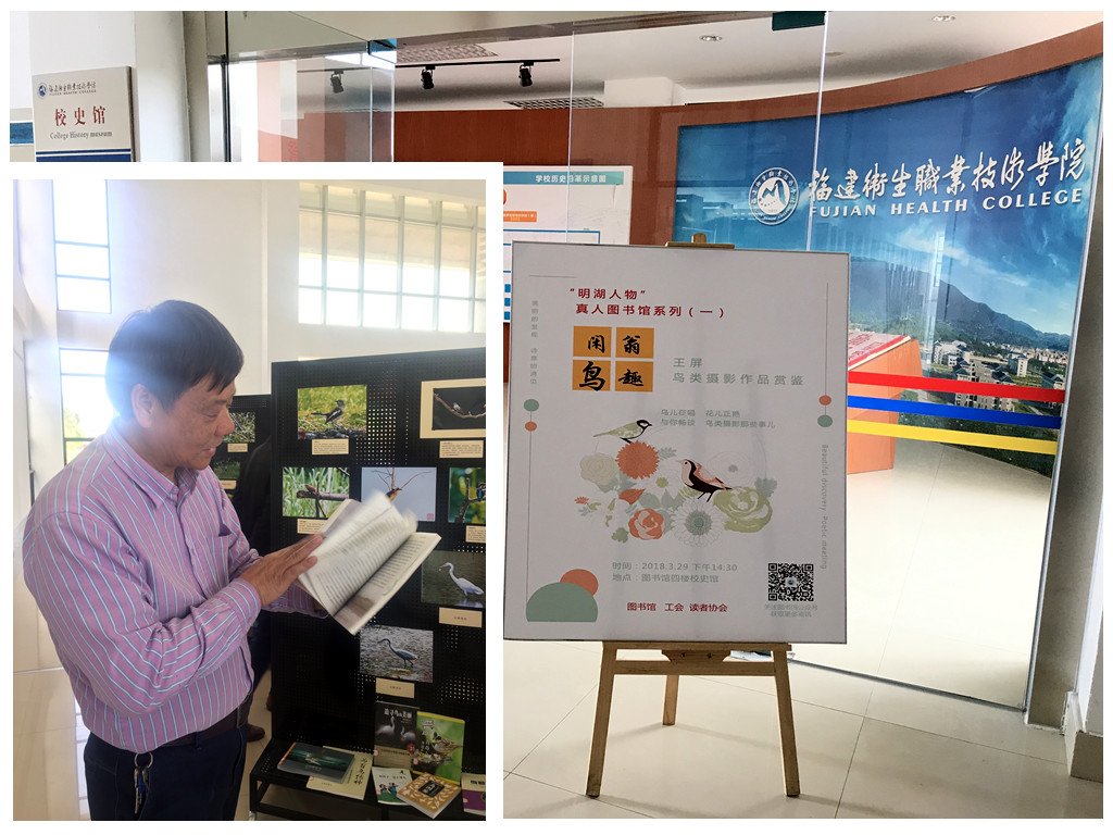 2018年3月29日14:30,圖書館在4樓校史館舉辦了第一期“明湖人物”真人圖書館,本期活動主題是“閑翁鳥趣”鳥類攝影作品鑒賞,主講嘉賓是福建省觀鳥協(xié)會會員王屏老師(原我院后勤管理處處長),學院工會副主席洪常青也蒞臨了本次活動。