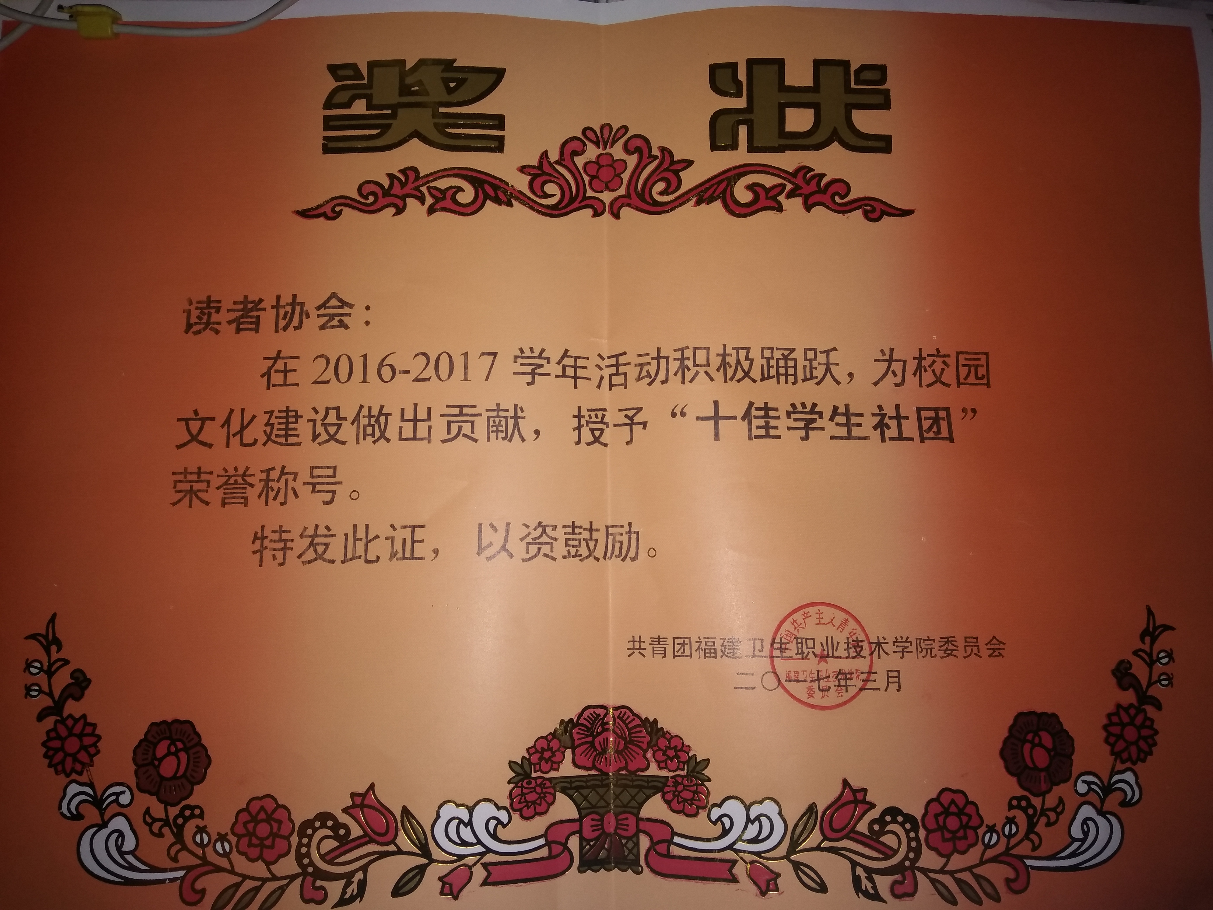 由圖書館教師指導的讀者協會,在2016-2017學年活動積極踴躍,為校園文化建設作出貢獻,被學院團委評為“十佳學生社團”、“十佳社團社長”。特此祝賀!