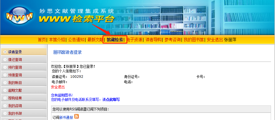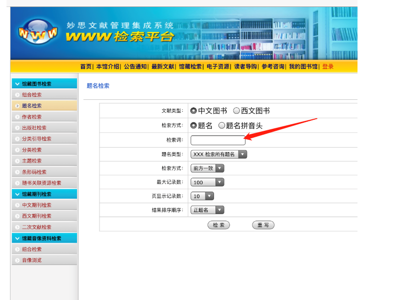 3、點(diǎn)擊“館藏書(shū)目檢索”,進(jìn)入書(shū)目檢索界面。