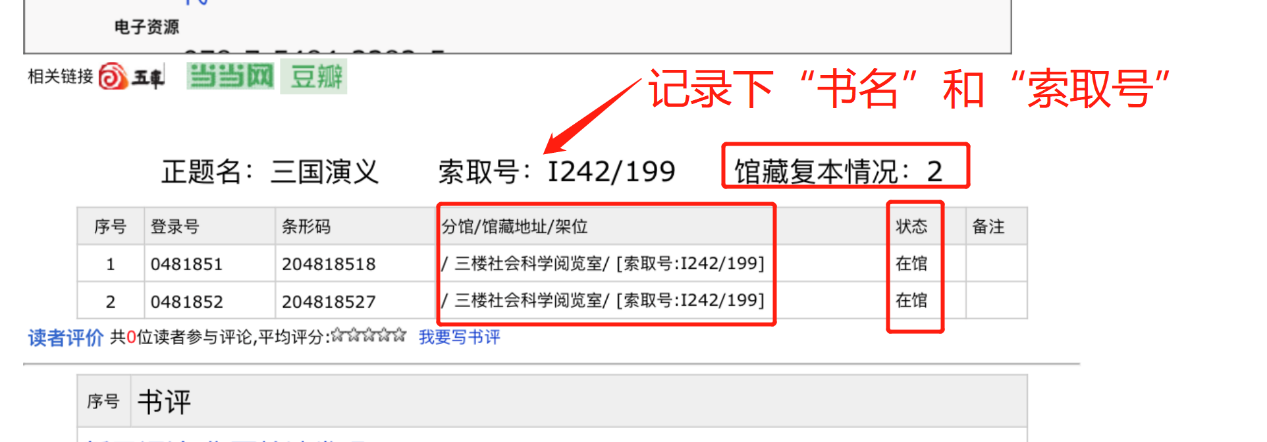 6、書(shū)目詳情頁(yè),可查看圖書(shū)的館藏復(fù)本、館藏地址及圖書(shū)狀態(tài)等詳細(xì)信息,記錄下書(shū)名和索取號(hào)等關(guān)鍵信息,即可入庫(kù)找書(shū);
