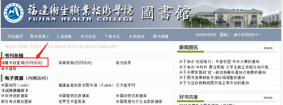 1. 打開(kāi)瀏覽器,輸入網(wǎng)址:www.fjwx.com.cn/,點(diǎn)擊網(wǎng)頁(yè)右側(cè)“機(jī)構(gòu)導(dǎo)航”--“教學(xué)教輔機(jī)構(gòu)”--“圖書(shū)館”--“館藏書(shū)目查詢(xún)”,即可進(jìn)入圖書(shū)檢索頁(yè)面