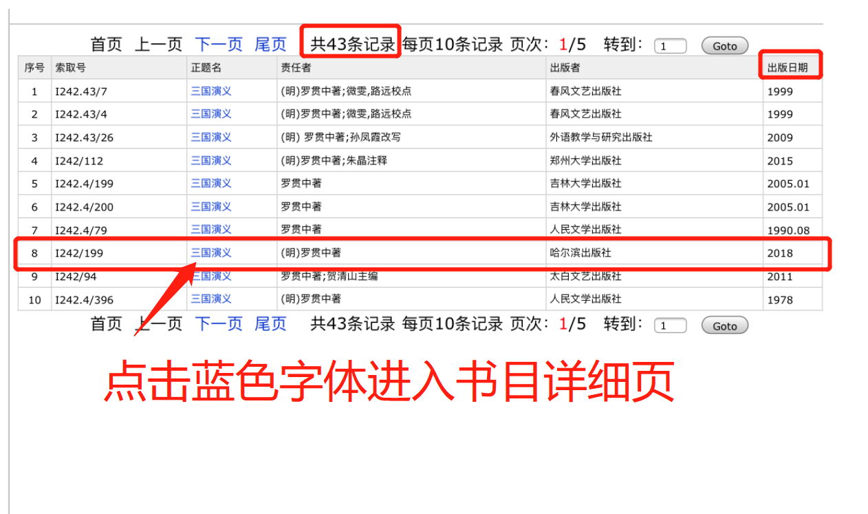 5、進(jìn)入檢索目錄頁(yè),查看檢索結(jié)果,點(diǎn)擊所需書(shū)目的正題名,進(jìn)入書(shū)目詳情頁(yè);