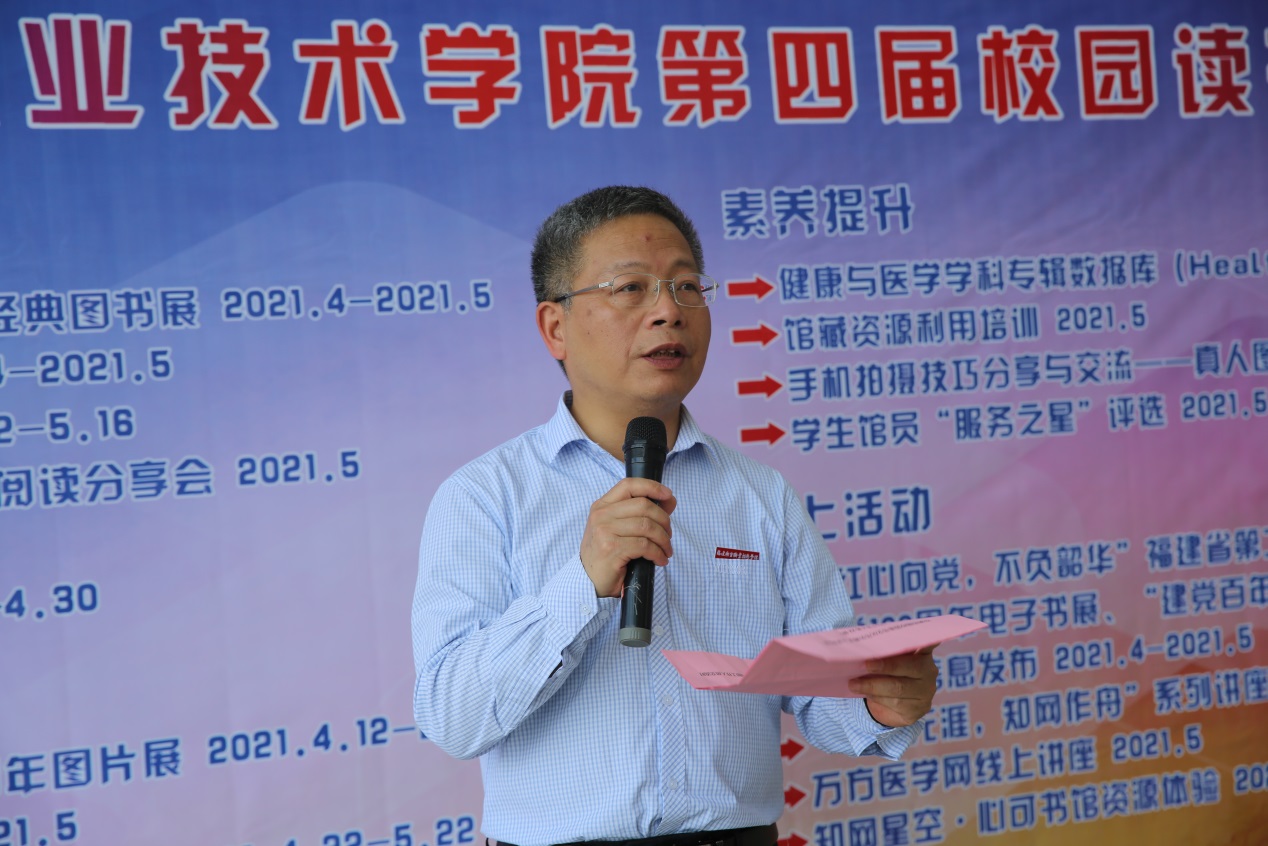 啟動式伊始,陳貞健致辭,他指出近年來黨中央、國務院高度重視全民閱讀,今年又恰逢中國共產黨百年華誕,圖書館充分發揮自身優勢和文化特色,將黨史學習教育與閱讀推廣相結合,通過形式多樣的閱讀推廣和文化交流活動,向廣大師生展示中國共產黨的百年光輝歷程,引導紅色閱讀,厚植文化自信,增強使命擔當。希望廣大師生能以此為契機,養成“愛讀書、多讀書、讀好書”的習慣,厚植“愛國、愛黨、愛校”情懷,珍惜寶貴時光,勤奮學習,力爭在開拓新征程中實現新作為。