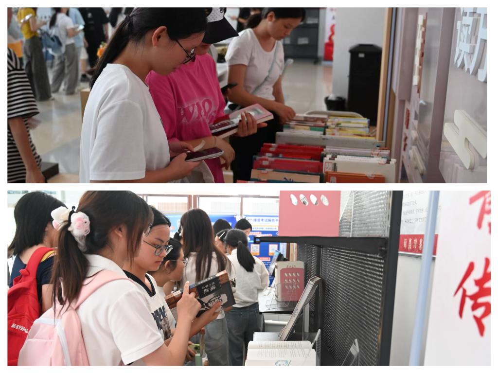 戲劇展播結(jié)束后,同學(xué)們前往圖書(shū)館一樓大廳借閱相關(guān)圖書(shū)。