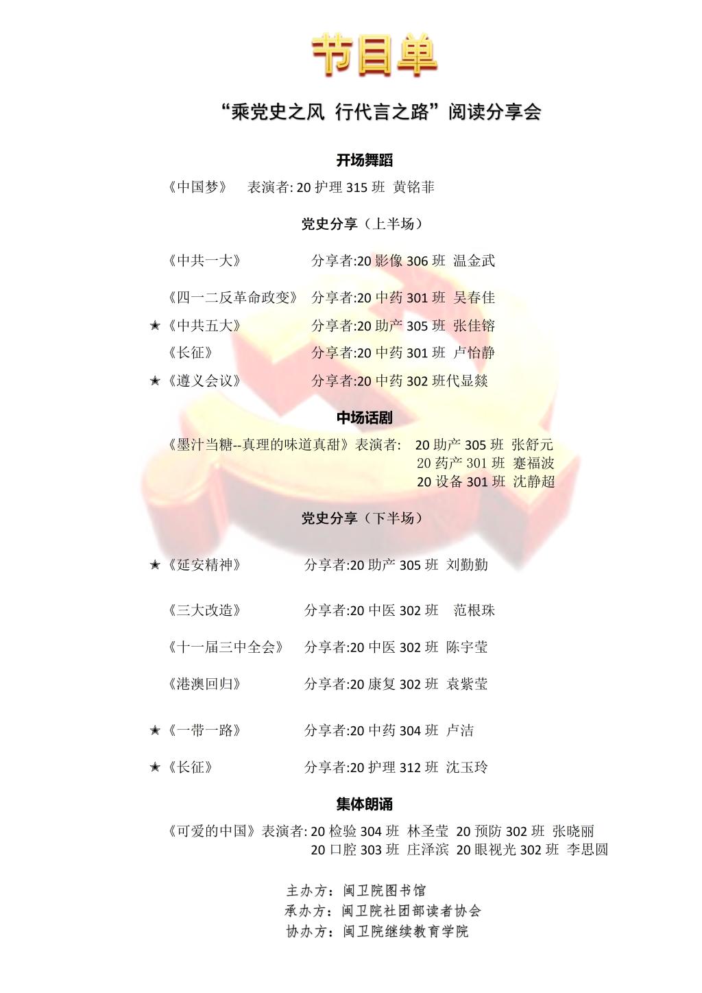 11位學生通過閱讀“中共一大”、“四一二反革命政變”、“中共五大”、“紅軍長征”、“遵義會議”、“延安精神”、“社會主義三大改造”、十一屆三中全會、“ 港澳回 歸”、“一帶一路”等黨史事件的相關書籍,分享自己的閱讀感悟。