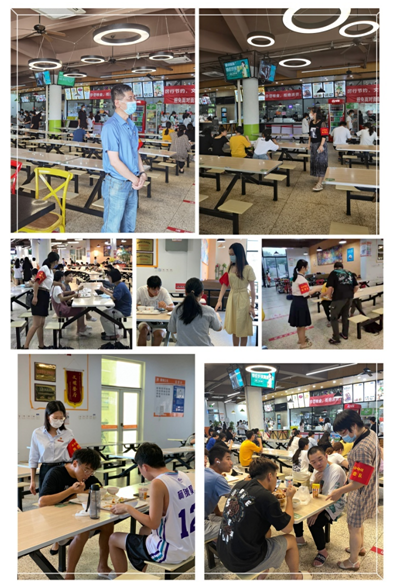為更好地傳承《1921》、《革命者》彰顯的革命精神和榜樣力量,踐行為人民的服務精神,在當前疫情防控的特殊時期,圖書館黨支部9月組織全體黨員定期開展衛生防疫督導執勤工作,主要負責明湖餐廳午晚餐時段執勤督導。通過黨員們熱情指引,耐心提醒,積極服務,明湖餐廳師生呈現出用餐和防疫的良好秩序。
