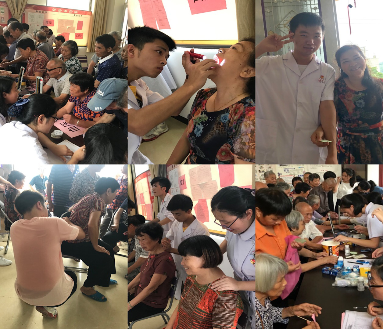 7月7日上午,實踐隊在新民村村部開展愛心醫療義診活動,前來就診的村民絡繹不絕,在導診同學的引領下,測血壓、血糖,推拿、按摩,測視力、檢查口腔,問診、取藥等有序不紊進行著,為現場七八十位老鄉免費發放了上千元藥品。同學們在與淳樸自然的村民洋洋灑灑的互動中,累并快樂著,汗水將他們的衣服浸濕,對每位村民的盡職盡責和耐心的態度受到村民們的點贊肯定。通過義診活動,讓同學生們感受到了運用自己所學的醫學知識去幫助別人是多么快樂的一件事,也更讓他們體會到了農村對醫療的渴望。