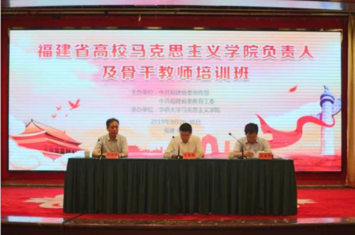 省委常委、省委宣傳部部長梁建勇審定本次培訓方案。省委宣傳部副部長肖貴新、省委教育工委副書記王建南,華僑大學黨委副書記、紀委書記畢明強,以及省委宣傳部理論處、省委教育工委思政處相關負責人出席開班式。肖貴新在開班式的講話中要求,我省馬克思主義學院要把握正確的政治方向,堅持“馬院姓馬,在馬言馬”,在重大問題上堅定不移同以習近平同志為核心的黨中央保持高度一致。他強調,高校黨委要著力加強意識形態陣地管理,對馬克思主義學院實行優先保障、政策傾斜,同時切實加強對馬克思主義學院的監督檢查,幫助馬克思主義學院辦出特色、辦出水平、取得實效。王建南在《推動高校思想政治理論課守正創新》的專題報告中強調,全省馬克思主義學院都要從辦好思政課是中國特色社會主義教育的本質要求的高度,努力按照“政治建院”“教學立院”“學科興院”“人才強院”“制度治院”的目標,真抓實干加強自身建設,以“有為”爭取“有位”。
