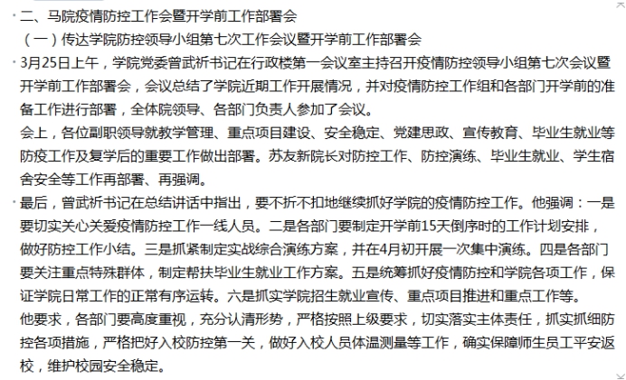 會上,熊美蘭院長首先傳達了校防控領導小組第七次工作會議暨開學前工作部署會精神。隨后,熊院長部署了馬院近期主要工作,分別就開學前15天的準備工作、實戰(zhàn)演練,角色扮演、上班人員安排、教學、經費使用、安全隱患排查、就業(yè)工作、2020年重點項目建設、2020年第二屆“衛(wèi)聲杯”之戰(zhàn)“疫”之聲活動等13項工作進行了認真安排和強調。接著,熊院長傳達學院務虛會精神及馬院交流匯報內容:《探索構建“3+X”思政實踐課育人模式》。