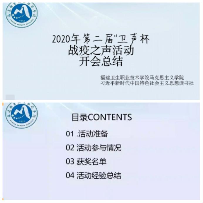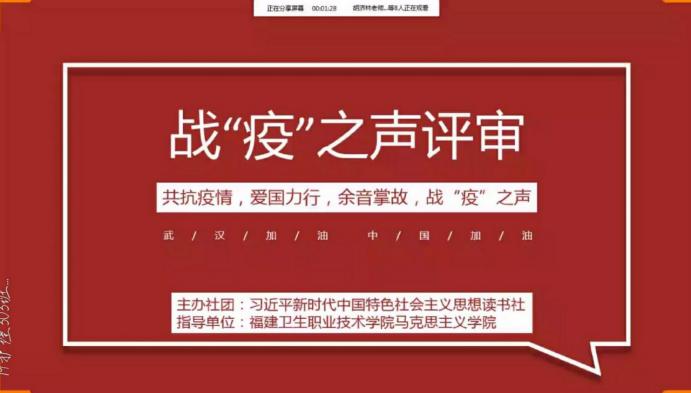 我校習近平新時代中國特色社會主義思想讀書社開展的第二屆"衛聲杯"戰"疫"之聲活動進入尾聲,收到52件作品申報參評,入圍作品15件于福建衛院天使吾修公眾號線上進行的公眾投票已截止。在進行了統計票數和作品整理后,于2020年5月6日晚7點,在QQ群平臺召開作品評審視頻會議。評審團由4位馬克思主義學院指導老師及8名讀書社干事組成,秉著公平公正與認真負責的態度做好作品評審工作。