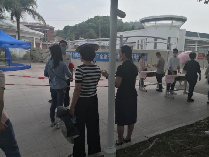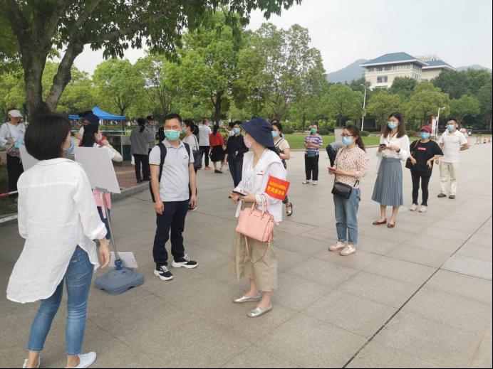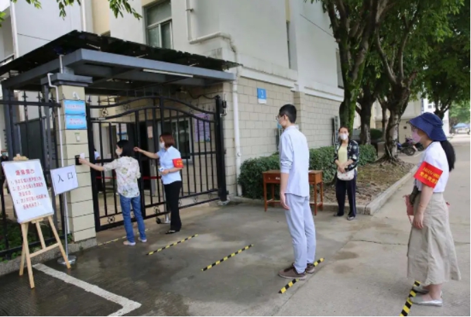 考生間隔1米排隊等待工作人員檢測。