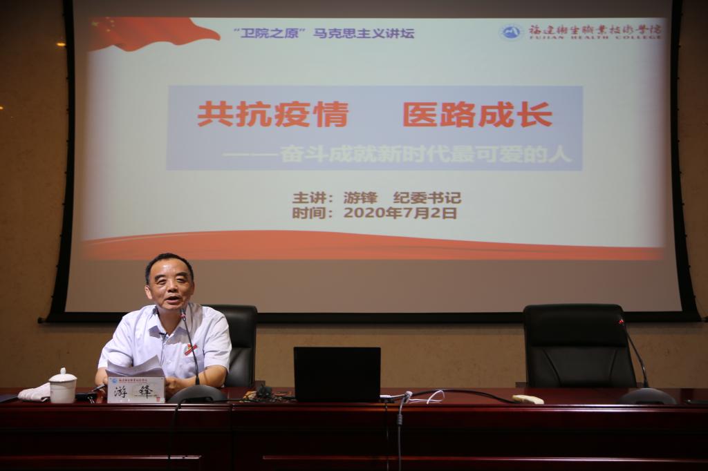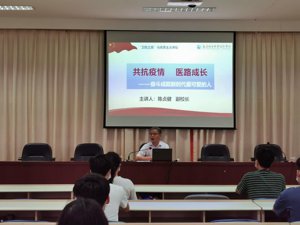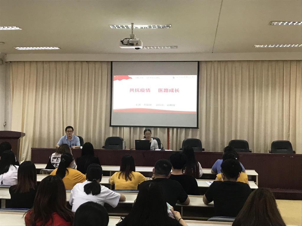 2020年6月11日、6月18日、7月2日我院黨委書記曾武祈、黨委副書記李美華、紀委書記游鋒、副校長陳貞健、副校長黃銘珊、副校長鄭翠紅等校領(lǐng)導以“共抗疫情,醫(yī)路成長——奮斗成就新時代”為主題紛紛走上講臺,分別為陸續(xù)返校的大二學生,精彩奉獻返校思政戰(zhàn)“疫”課,將新冠肺炎疫情防控生動感人的實踐轉(zhuǎn)化為鮮活有力的思政育人元素,引導衛(wèi)院學子以青春奮斗擔當精神,堅定理想信念,站穩(wěn)人民立場,練就過硬本領(lǐng),投身強國偉業(yè)。各系等返校學生,黨政領(lǐng)導干部、思政課教師和輔導員也齊聚課堂聆聽,未返校的學生也通過釘釘課堂、騰訊會議等網(wǎng)上平臺在線觀看學習,開展線上交流和討論。