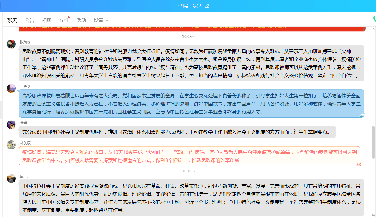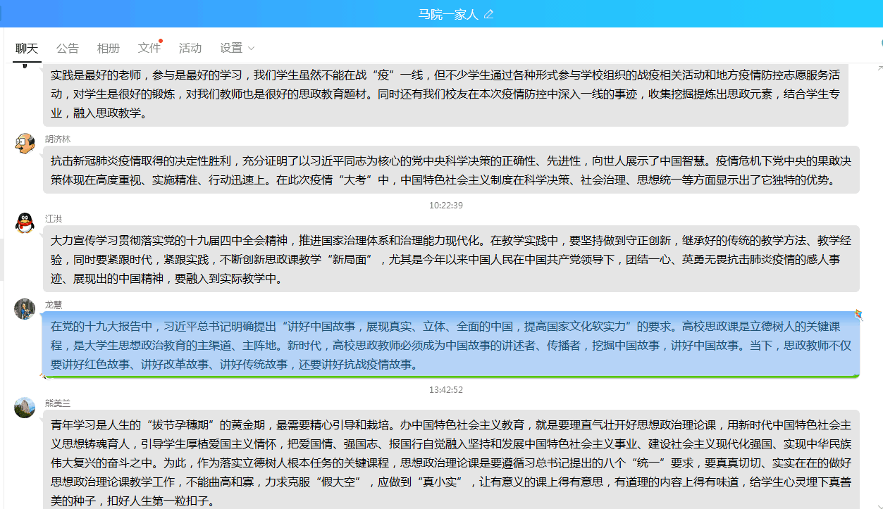 除了開展集中線上理論學習外,馬克思主義學院還組織全體教師開展了集中線上網絡研討,全體教師分別就“結合自身工作崗位實際,黨的十九屆四中全會精神、抗擊新冠肺炎疫情中涌現出的戰‘疫’精神如何融入到馬克思主義理論研究和思政課教學”以及“結合自身的思政主干課教學,如何做到‘八個相統一’來推動課程改革創新”兩大主題開展了網絡研討,積極碰撞思維火花,建言獻策,以期更好地推動思政課程教學改革與創新。研討中,老師們紛紛表示作為思政教師,應以“八個相統一”為教育教學標準,增強教書育人本領,把“思政小課堂”同“社會大課堂”結合起來,用心用情講好中國故事,傳播中國好聲音,打造有政治高度、有理論深度、有感情溫度的課堂,增強思政課程的思想性、理論性、親和力和針對性,起到強信心、暖人心、聚民心的作用,幫助青年扣好人生第一粒扣子,培養擔當民族復興大任的時代新人。