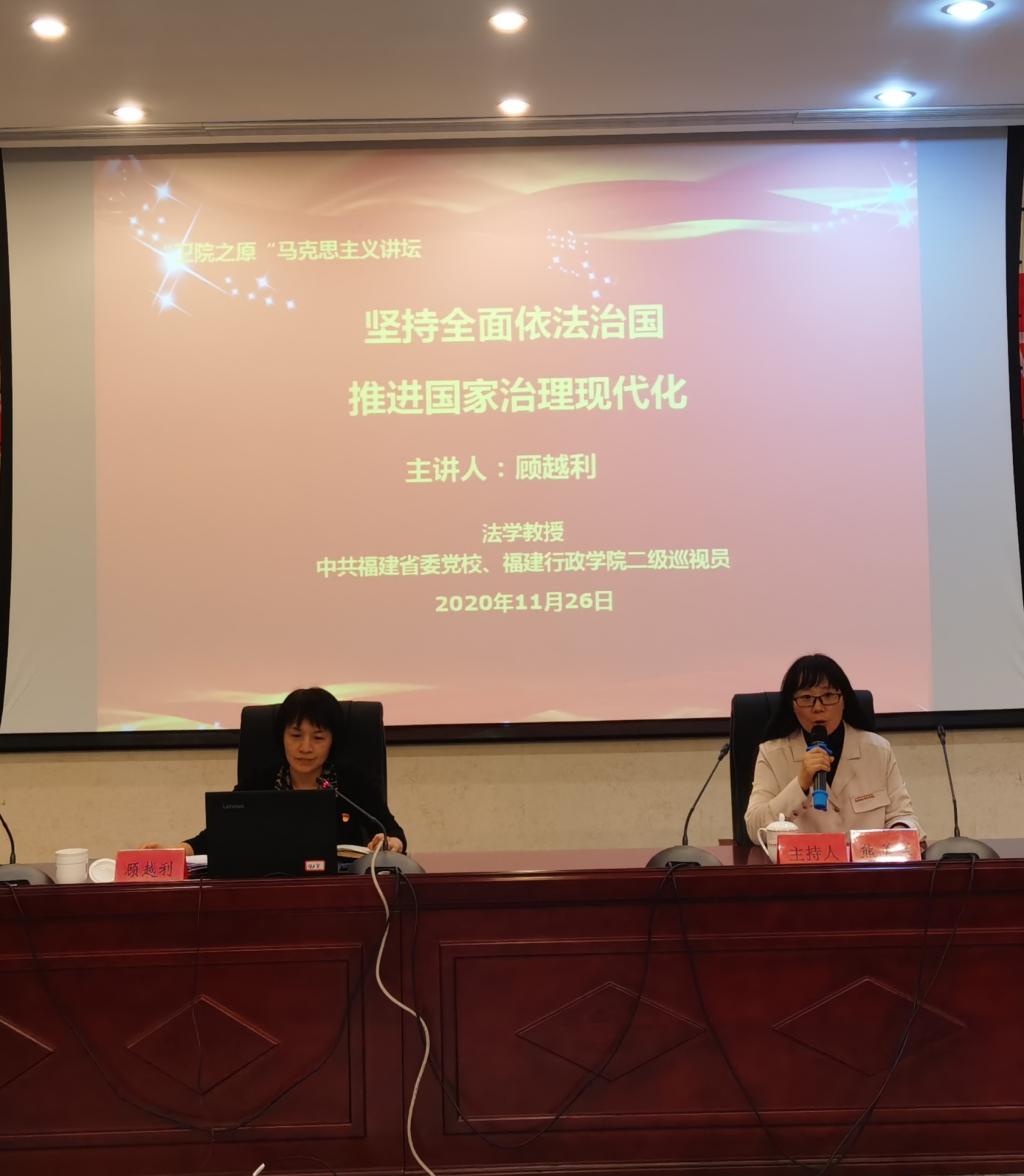 法治興則國興,法治強則國強。全面依法治國是一項長期而重大的歷史任務,也是國家治理領域一場廣泛而深刻的革命。為深刻理解黨的十九屆五中全會審議通過的《中共中央關于制定國民經濟和社會發(fā)展第十四個五年規(guī)劃和2035年遠景目標的建議》中提出的“國家治理效能得到新提升”、“社會主義民主法治更加健全”和到2035年“基本建成法治國家、法治政府、法治社會”的目標任務;同時提升廣大師生對“全面依法治國”在“四個全面”戰(zhàn)略布局中基礎性作用的理解,筑牢法治意識,不斷提高法治思維,2020年11月26日下午,學校特邀中共福建省委黨校顧越利教授作《堅持全面依法治國推進國家治理現代化》專題講座。馬院全體專兼職教師以及青馬班學員參加了此次講座。