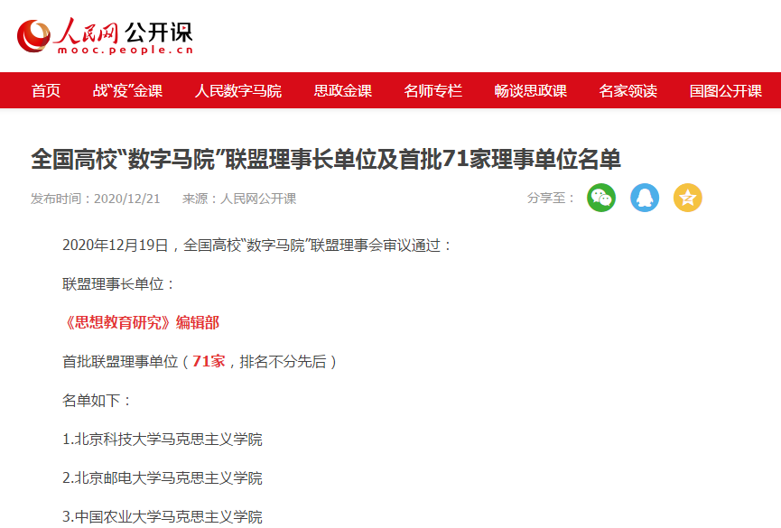 2020年12月19日,經(jīng)由全國高校“數(shù)字馬院”聯(lián)盟理事會(huì)審議,我校馬克思主義學(xué)院被評選為全國高校“數(shù)字馬院”聯(lián)盟首批理事單位,福建省僅2家被選上。此次全國高校“數(shù)字馬院”聯(lián)盟理事會(huì)共審議通過全國71家首批聯(lián)盟理事單位。