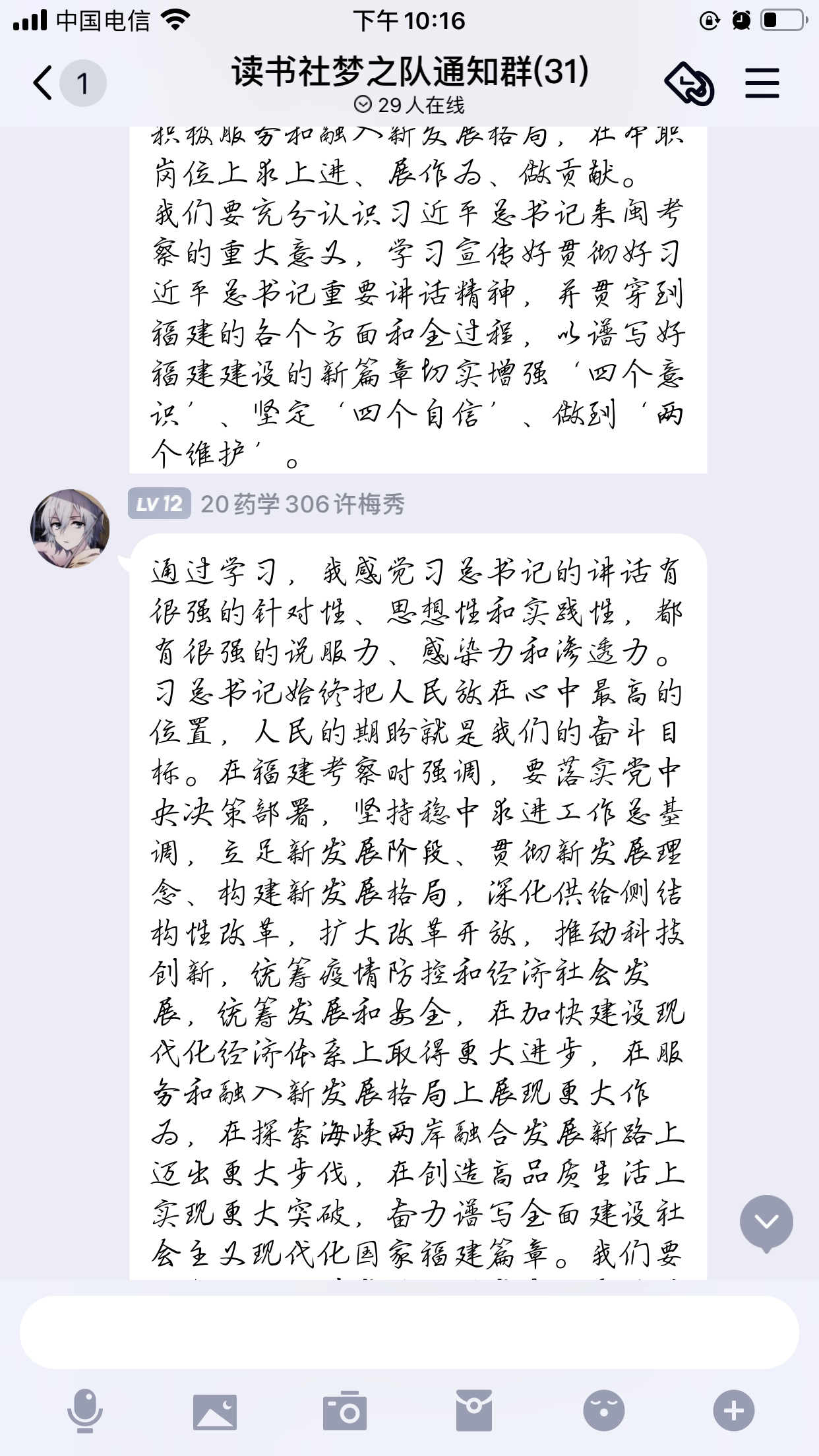 我校馬克思主義學(xué)院思政課教師從習(xí)近平總書(shū)記福建行第一站開(kāi)始就密切關(guān)注相關(guān)信息,高度關(guān)注習(xí)近平總書(shū)記關(guān)心關(guān)注福建改革發(fā)展的相關(guān)問(wèn)題。以“習(xí)近平福建行”為主題,馬院理論學(xué)習(xí)中心組召開(kāi)理論學(xué)習(xí)中心組會(huì),直屬馬克思主義學(xué)院第一、第二黨小組召開(kāi)黨小組會(huì)進(jìn)行熱烈討論。從QQ群即興交流中流露出我校思政人對(duì)國(guó)家發(fā)展、福建改革的情懷與關(guān)切。習(xí)近平總書(shū)記曾說(shuō):“對(duì)國(guó)之大者要心中數(shù)。”我校思政課教師不局限于即興交流,更是靜心思考,以“習(xí)近平福建行”為背景開(kāi)展中心組學(xué)習(xí)及黨小組專題討論,還組織習(xí)近平新時(shí)代中國(guó)特色社會(huì)主義思想讀書(shū)社、時(shí)代先鋒等社團(tuán)成員開(kāi)展“習(xí)近平福建行”大討論。跟隨習(xí)近平總書(shū)記的腳步,討論的話題從南平、三明到福州、從國(guó)家公園、生態(tài)茶園、文化保護(hù)單位到醫(yī)院、農(nóng)村、企業(yè)、學(xué)校。我校師生對(duì)改革發(fā)展的新形勢(shì)、新要求有了更加深刻的認(rèn)識(shí)。