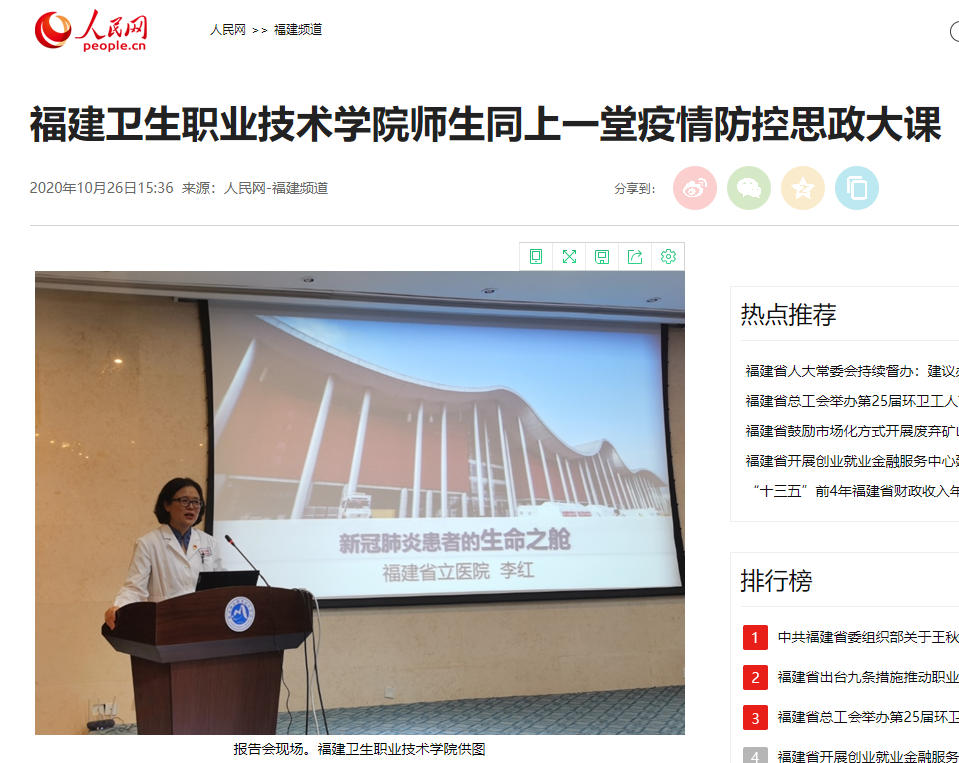 2020年特別針對偉大抗疫精神融入專題化教學上不斷突破,緊扣新冠肺炎疫情防控重點工作,組織全校師生同上全國高校“疫情防控思政大課”,打造《解碼戰勝疫情背后的中華優秀傳統文化》等6堂思政課戰疫小課堂,編寫50個“抗疫”思政案例。《凝心打贏疫情防控阻擊戰,聚力培育戰“疫”思想疫苗》、《福建衛生職業技術學院開講疫情防控思政第一課》、《疫情大考告訴我們什么?——疫情防控思政大課引閩衛院熱議》等報道,獲得人民網、東南網、福建省教育廳、福建高校思政網、全國高職高專院校思政課建設聯盟網等主媒宣傳。