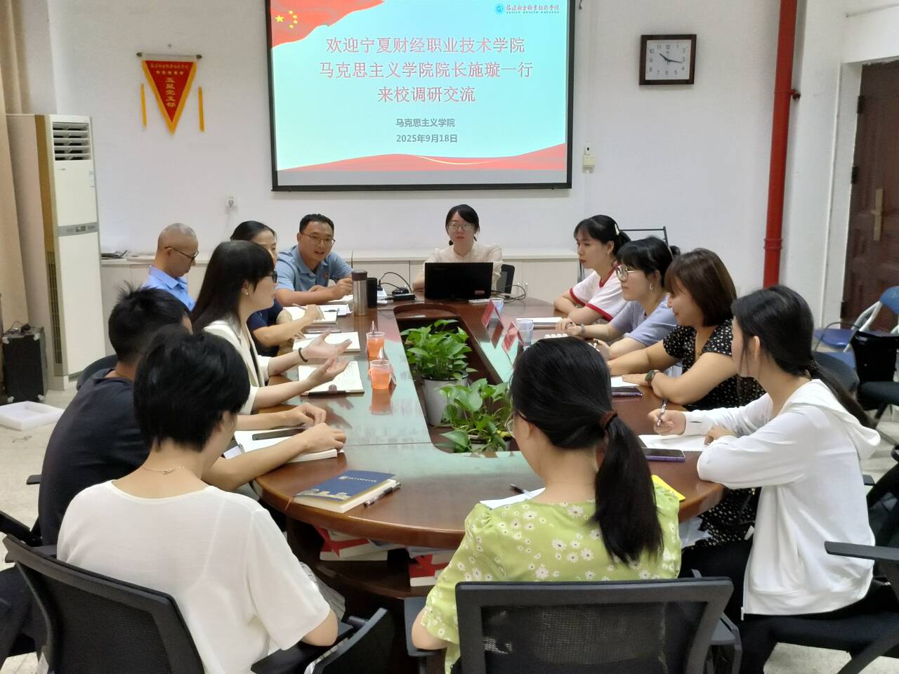 為深化思政課改革創(chuàng)新,促進地域間思政教育經(jīng)驗互鑒,共同提升立德樹人實效,9月18日,寧夏財經(jīng)職業(yè)技術(shù)學(xué)院馬克思主義學(xué)院院長施璇一行4人來我校調(diào)研交流。我校馬克思主義學(xué)院負責(zé)人、教研室主任參加交流活動。