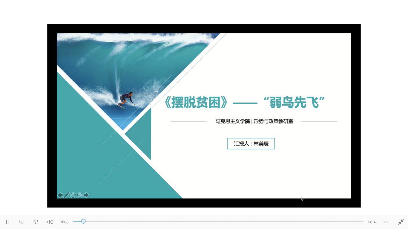活動中,林美辰首先為我們介紹了《弱鳥如何先飛》這篇文章的背景介紹。這篇調查隨感,是習近平擔任寧德地委書記期間,協同地區幾位領導同志調研了閩東九縣,比較系統地闡述了如何認識貧困地區發展、貧困地區如何發展兩大問題。接著,她從該文章架構與導向、主要內容等方面進行研讀。其中包括“先飛”意識--直面問題;關于飛洋過海的藝術--解決策略;怎樣豐滿羽翼--實施的途徑。最后,她為我們分享了啟示。她說道,作為思政課教師,更應該學習“弱鳥先飛”堅持問題導向和調查研究,凸顯辯證觀點。在教學與教研的過程中,更多地解放思想、推進實踐,努力提升自身教學能力與水平,實現順利地開展工作。