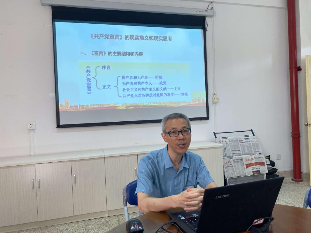 活動中,胡濟林首先從《宣言》的主要結構和內容、現實意義及價值兩個方面進行了研讀,介紹了《宣言》序言和正文兩個部分以及《宣言》對走好中國特色社會主義道路的重要指導作用等。其次,他從“馬克思主義理論對戰后資本主義發展的影響”“社會主義必然勝利”“社會主義在中國展現出的優越性”三個方面談了讀《宣言》后的現實思考。