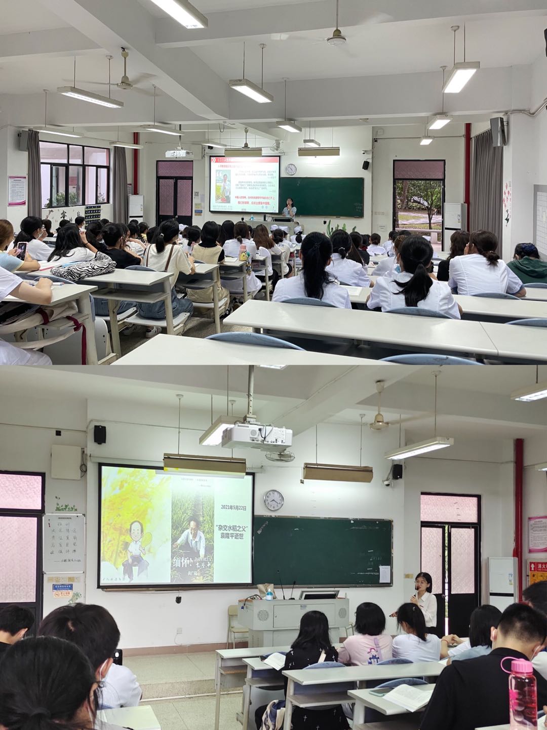 課堂上,任課教師向學生介紹袁隆平院士的事跡。袁隆平將讓“所有人遠離饑餓”作為畢生追求。同時,課堂結合袁隆平“禾下乘涼夢、雜交水稻覆蓋全球夢”,引導學生“中國人的飯碗,要牢牢掌握到自己手上去”,同學們深受袁隆平事跡的感動。通過此次教學引導,學生深刻認識糧食來之不易以及糧食安全的重要性。課堂上,任教老師還講授了生態文明、綠色發展理念的相關知識,引導學生認識和理解綠色發展,爭做具有生態文明價值觀的醫藥衛生人才。
