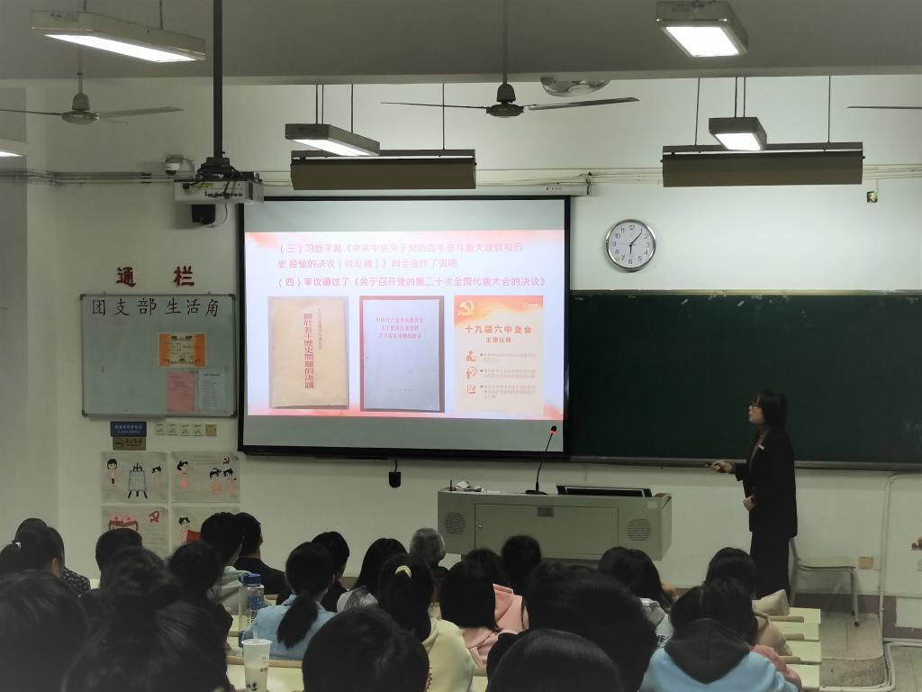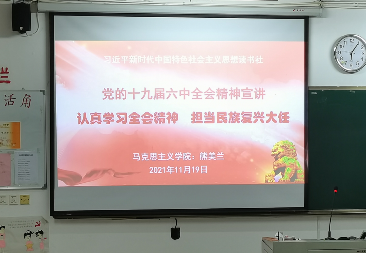 2021年11月19日在教學(xué)樓105教室召開習(xí)近平新時(shí)代中國特色社會(huì)主義思想讀書社全體成員大會(huì),2020級(jí)、2021級(jí)同學(xué)及熊美蘭、胡濟(jì)林、羅蕓、江洪等指導(dǎo)老師近120人參會(huì)。熊美蘭以“認(rèn)真學(xué)習(xí)全會(huì)精神 擔(dān)當(dāng)民族復(fù)興大任”為題開展黨的十九屆六中全會(huì)精神宣講。
