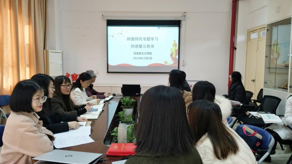 為進一步提高直屬馬克思主義學院黨支部教師的師德水平,建設一支高素質的黨員教師隊伍,2021年12月2日上午,直屬馬克思主義學院黨支部在107會議室開展師德師風警示教育專題學習,學習由直屬馬克思主義學院黨支部書記熊美蘭主持,支部全體教師黨員出席。