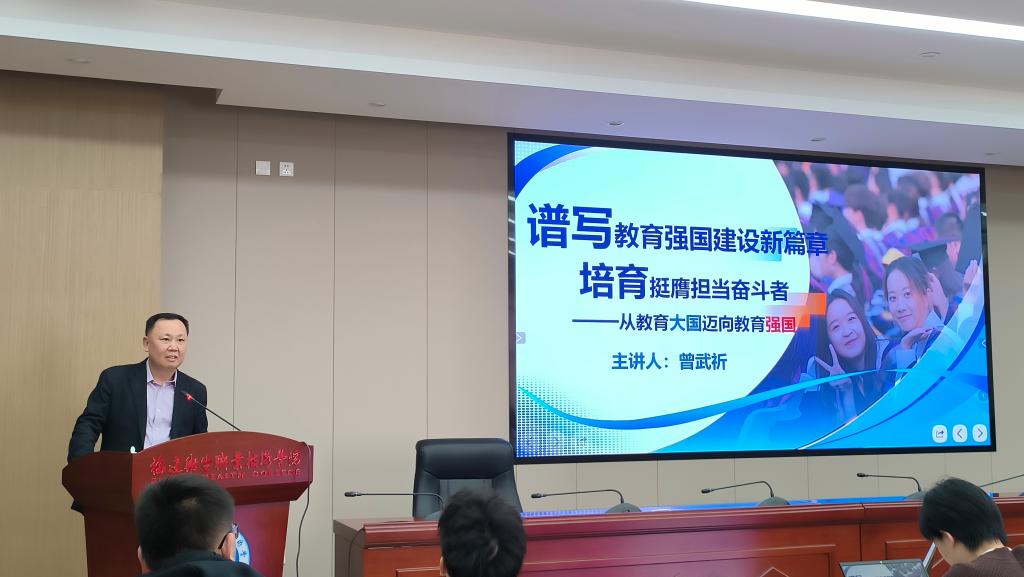 曾武祈緊緊圍繞“教育強(qiáng)國”這一主題,從“為什么建:堅(jiān)實(shí)基礎(chǔ) 戰(zhàn)略支撐”“建成什么:“蓬勃發(fā)展 優(yōu)質(zhì)均衡”“怎樣建設(shè):深化改革 系統(tǒng)推進(jìn)”“我校行動(dòng):錨定目標(biāo) 篤行實(shí)干”等四個(gè)方面進(jìn)行深入闡述。此次專題黨課讓支部全體黨員對(duì)“堅(jiān)持教育優(yōu)先發(fā)展”“加快建設(shè)教育強(qiáng)國”“福建教育實(shí)踐”等一系列戰(zhàn)略決策部署有了更加深刻的認(rèn)識(shí),進(jìn)一步增強(qiáng)思政課教師教書育人的責(zé)任感和使命感。