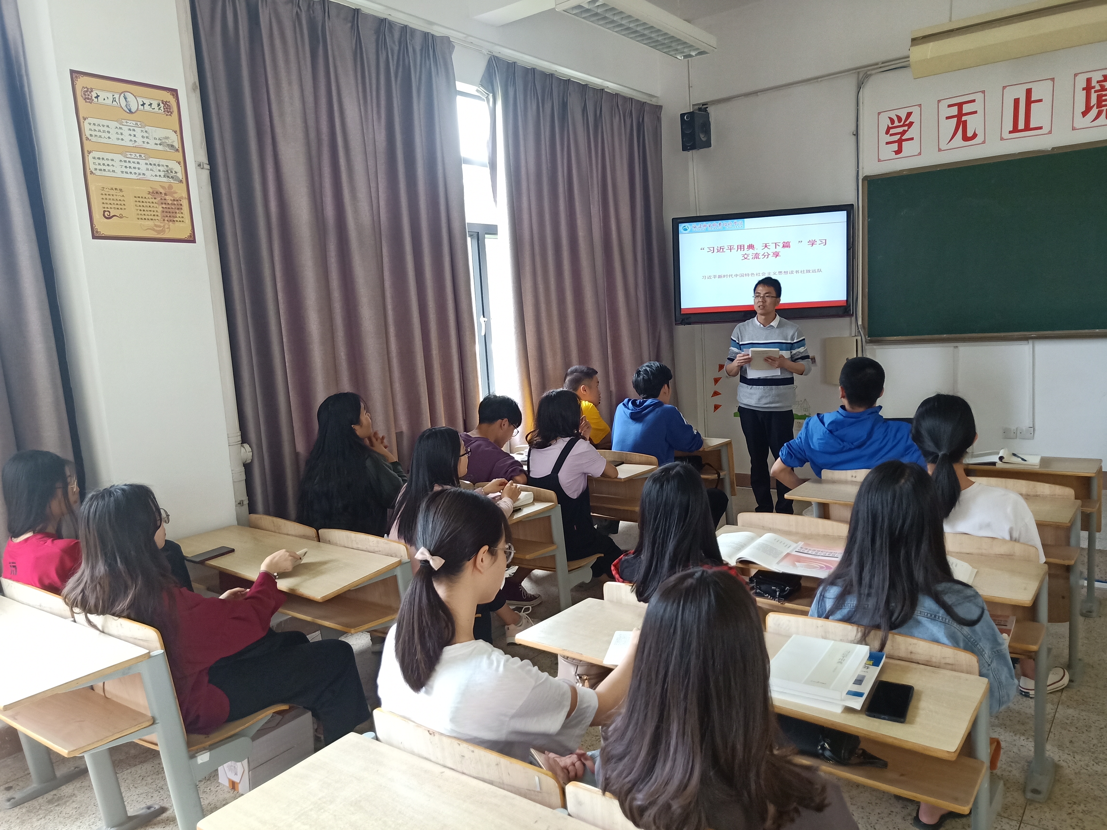 此次讀書活動的主題是學習交流分享“習近平用典.天下篇”。江洪老師對這篇當中的“計利當計天下利”、“浩渺行無極,揚帆但信風”、“一花獨放不是春,百花齊放春滿園”、“物之不齊,物之情也”、“己所不欲,勿施于人”等等典故展開了深入的講解,既讓同學們掌握這些典故在原典中的意思,更重要的是讓同學們充分體會和理解到習近平總書記引用這些典故的深刻意義。在學習的過程中,江老師和同學分廣泛交流互動,讓同學們充分發表自己的學習心得,并時不時給予點評和指導。