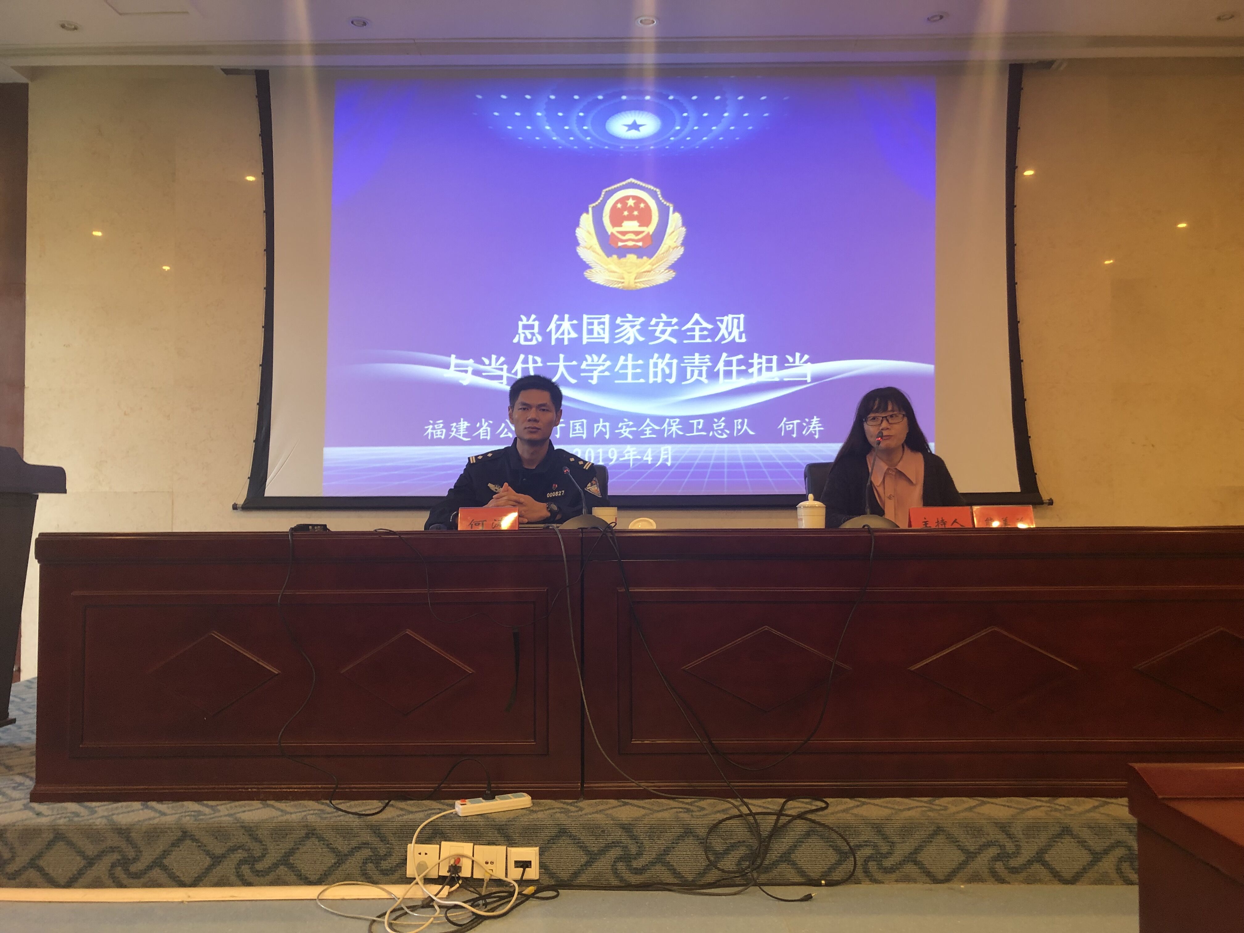 為深入學習貫徹習近平新時代中國特色社會主義思想,堅持總體國家安全觀,著力防范化解重大風險,結合福建衛生職業技術學院“4·15”國家安全日教育系列活動要求,于2019年4月18日下午,福建省公安廳一級警長何濤受邀在實訓樓四樓報告廳為廣大師生開設題為《總體國家安全觀與當代大學生的責任擔當》的專題講座。講座由馬克思主義學院院長熊美蘭主持,思想政治理論課教師,習近平新時代中國特色社會主義思想讀書社、時代先鋒協會等馬克思主義理論學生社團成員,校輿情引導隊和藥學系等學生代表等共230多人參加了此次講座。