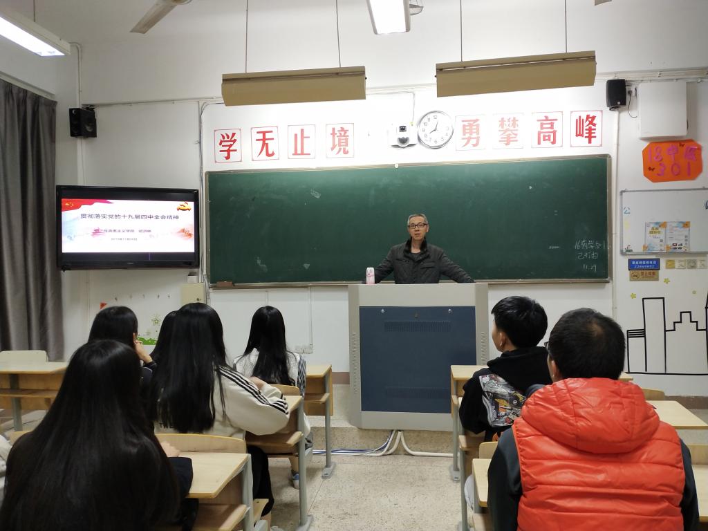 會議伊始由田曉茜同學向大家進行“探索人生哲理 追逐真理光芒”的示范宣講。接著胡濟林老師展開了貫徹落實黨的十九屆四中全會精神的專題報告。胡老師主要從堅持三者有機統一是加強和完善國家治理的戰(zhàn)略選擇、黨的領導是中國特色社會主義制度的最大優(yōu)勢、人民當家作主是社會主義民主政治的本質和核心、全面依法治國是國家治理的一場深刻革命等四個方面向同學們闡述了黨的十九屆四中全會精神。隨后林成暢同學結合唯物辯證法的基本原理,解析如何維護憲法權威的寫作思路。最后同學們圍繞“學習黨的十九屆四中全會精神,增強憲法意識弘揚憲法精神”的宣講任務進行了分工。