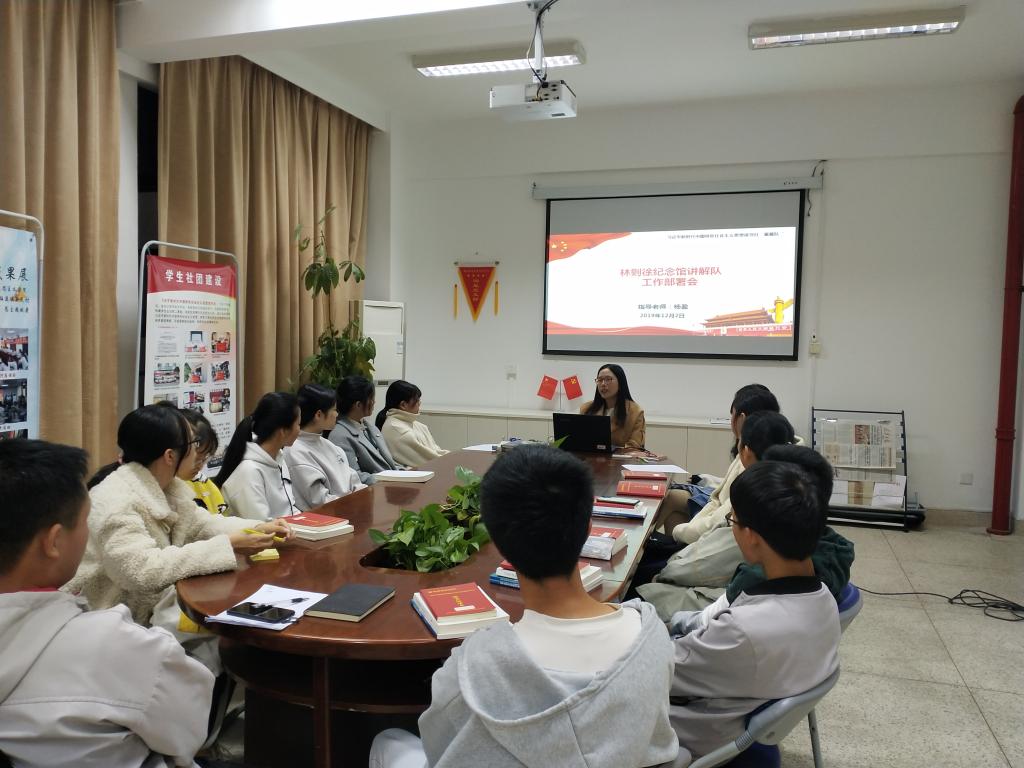 2019年11月2日,在馬克思主義學院的組織下,習近平新時代中國特色社會主義大學生宣講暨三館志愿講解隊成立大會召開。根據講解隊的工作要求,12月2日林則徐紀念館講解隊召開了工作部署會議。此次部署會議由講解隊指導老師楊盈主持,七位講解隊員和讀書社星星隊的成員們參加了此次會議。