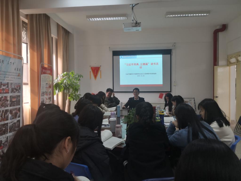 為深入學習宣傳貫徹習近平新時代中國特色社會主義思想,2019年12月24日下午,習近平新時代中國特色社會主義思想讀書社致遠隊在行政樓107學習交流《習近平用典》立德篇。活動由指導老師江洪老師主持,致遠隊全體成員參加了活動。