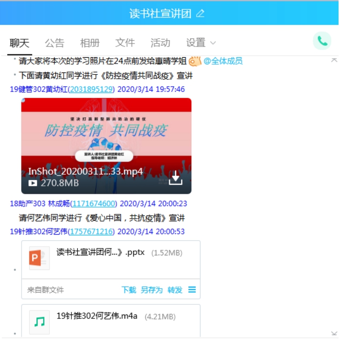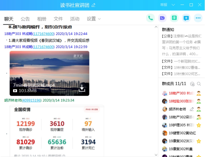 “只待三月春風來,櫻花翩翩終始開。”三月是個美麗的季節,愿時光不負努力,生活總會多一些明媚。經過前期宣講團成員們的充分準備,我們于2020年3月14日19:20分,開展了“同舟共濟,全民戰‘役'”宣講活動,出席此次活動的不只有讀書社宣講團全體成員,還有指導老師——胡濟林老師,此次宣“疫”活動是以線上的方式在宣講團qq群中開展。