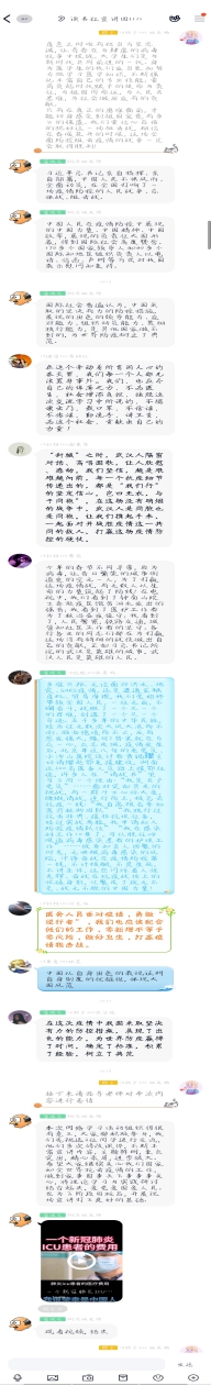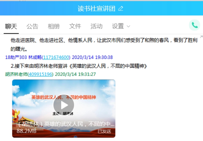 在活動開始前,由團長組織簽到點名。活動正式開始后,第一個環節是全體成員觀看視頻《春到武漢城》并在群里進行觀后感交流。通過觀看視頻大家體會到了全國人民齊心抗擊疫情的決心和永不服輸的精神,還感受到了黨和國家對于人民生命健康的高度重視,同時也看到戰勝疫情的希望。