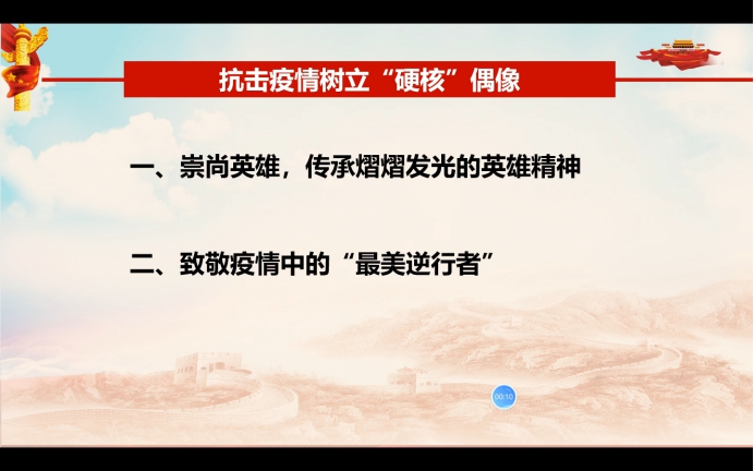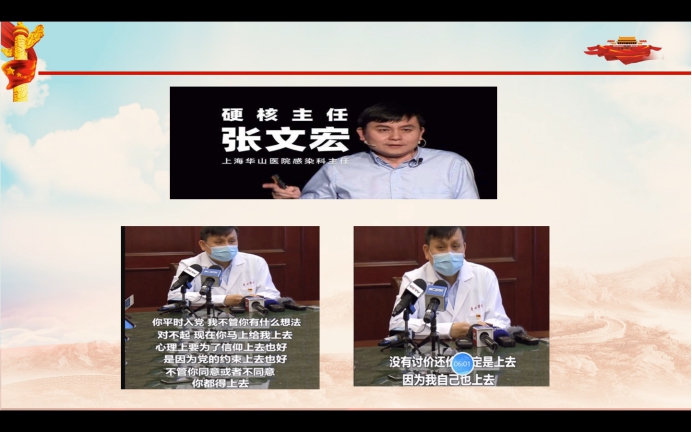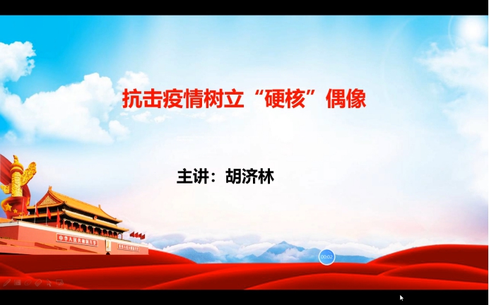 觀看完視頻后,胡濟林老師進行了《抗擊疫情樹立“硬核”偶像》的專題報告,胡濟林老師從“崇尚英雄,傳承熠熠發光的英雄精神”和“致敬疫情中的最美逆行者”兩個方面向我們講述了我們的國家英雄,讓我們知道了這世上沒有從天而降的英雄,只有挺身而出的普通人,在疫情面前,每一位堅守崗位的人都是令人尊敬的“最美逆行者”。英雄,是這個時代最寶貴的財富,是這個時代最堅強的脊梁。
