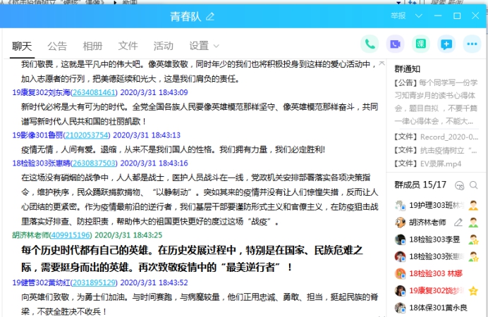 疫情最是無情,人民初心最暖,在這場全國上下共同面對的疫情防控戰役中,抗疫英雄事跡總是讓我們感動不已。為了謳歌在這場戰役中一大批“逆行者”的無私奉獻,展現全心全意為人民服務的精神氣概,2020年3月31日晚18.00習近平新時代中國特色社會主義思想青春隊的同學們在胡濟林老師的指導下開展了第二次抗擊疫情的線上交流學習。