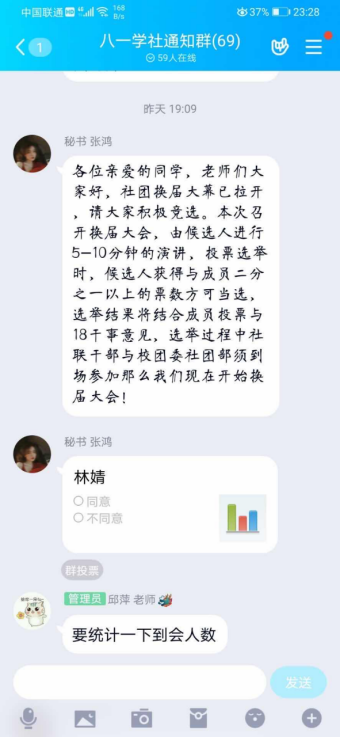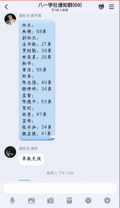 江山代有才人出,新學年,八一學社也迎來了一股新的朝氣。2020年4月11日19時,八一學社換屆大會在線上“八一學社QQ通知群”如期舉行,全體新老社員和指導老師邱萍、張崇飛參加了此次活動。本次換屆活動包含競選人演講、投票、計票、監票、選出相關職位人員、指導老師講話等環節。