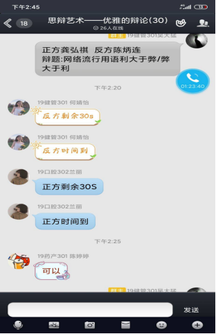 人在家中坐,切磋課中來。2020年5月12日演講與辯論社團在“思辨藝術——優雅的辯論QQ群”如期舉行一場別開生面的1v1辯論賽。本次的指導老師徐舒寧,選修課全體同學參加了此活動。