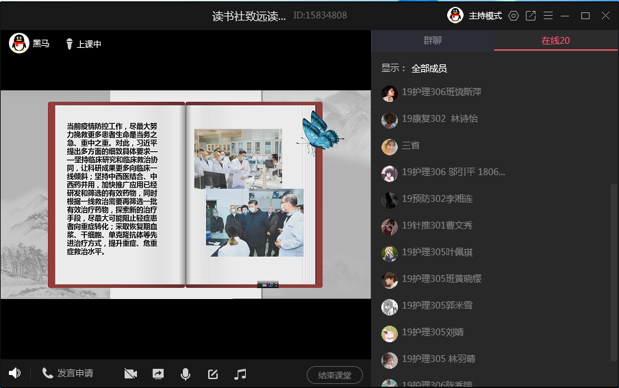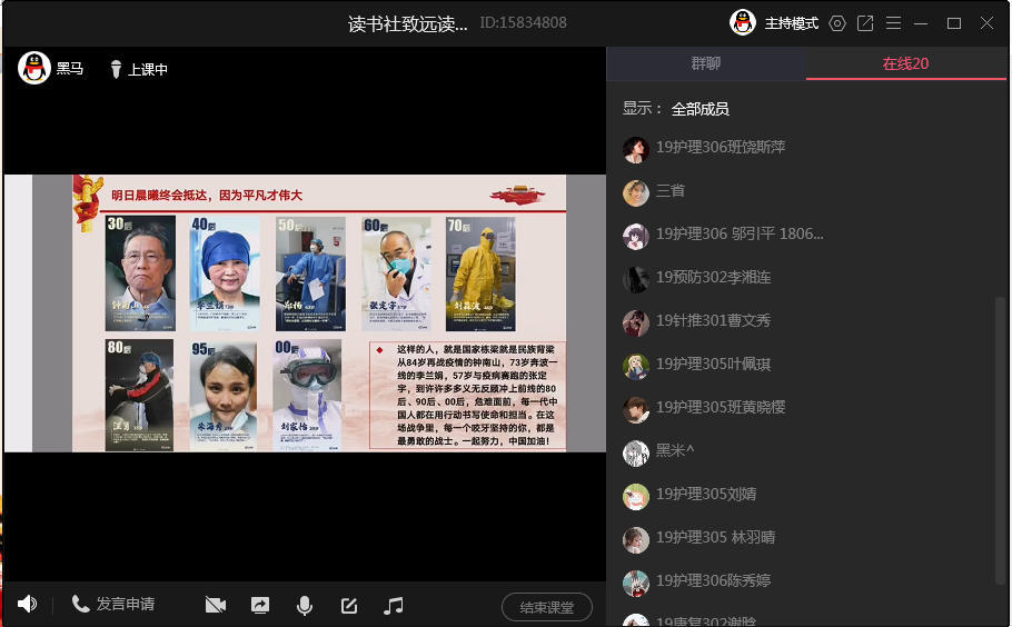 前期,同學們分成幾組,圍繞中國防控疫情的重大事件,各自制作了微視頻。在本次交流展示活動中,第一組的同學談了他們對這次疫情的認識,以及如何做好防護措施等內容;第二組的微視頻介紹了鐘南山院士和“95后”護士抗擊疫情的感人故事;第三組的微視頻講述了李蘭娟、張定宇、朱海秀等醫(yī)護工作人員與新冠病毒斗爭的先進事跡;第四組的微視頻深刻闡述了習近平新時代中國特色社會主義思想的重要作用;第五組同學從武漢封城、火神山和雷神山方艙醫(yī)院的建立、中國特色社會主義制度的優(yōu)越性和先進性以及世界衛(wèi)生組織對中國抗疫的評價等角度制作了視頻;第六組同學在視頻中為我們講述了“最美面罩姐姐”、“‘鐵娘子’落淚”等感人故事。