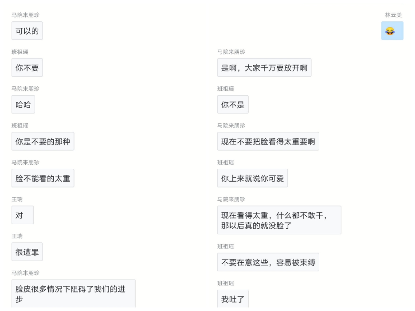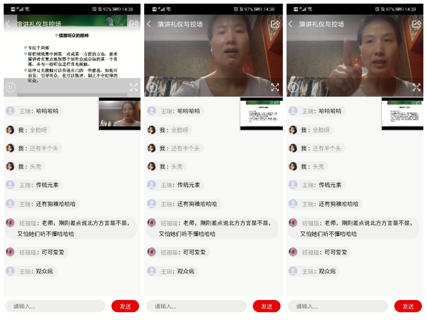 其中,作為班長的王旭熙同學以其主題為“不要臉”的脫口秀使人印象深刻,深入人心,還有鄭盈盈同學講述的“健忘”故事,引起了大家的強烈共鳴。同時,來朋珍老師及演講班的同學在其聊天框里“實時熱聊”,對同學們的表現進行了“一對一”的點評。