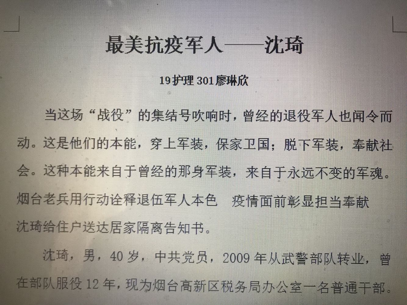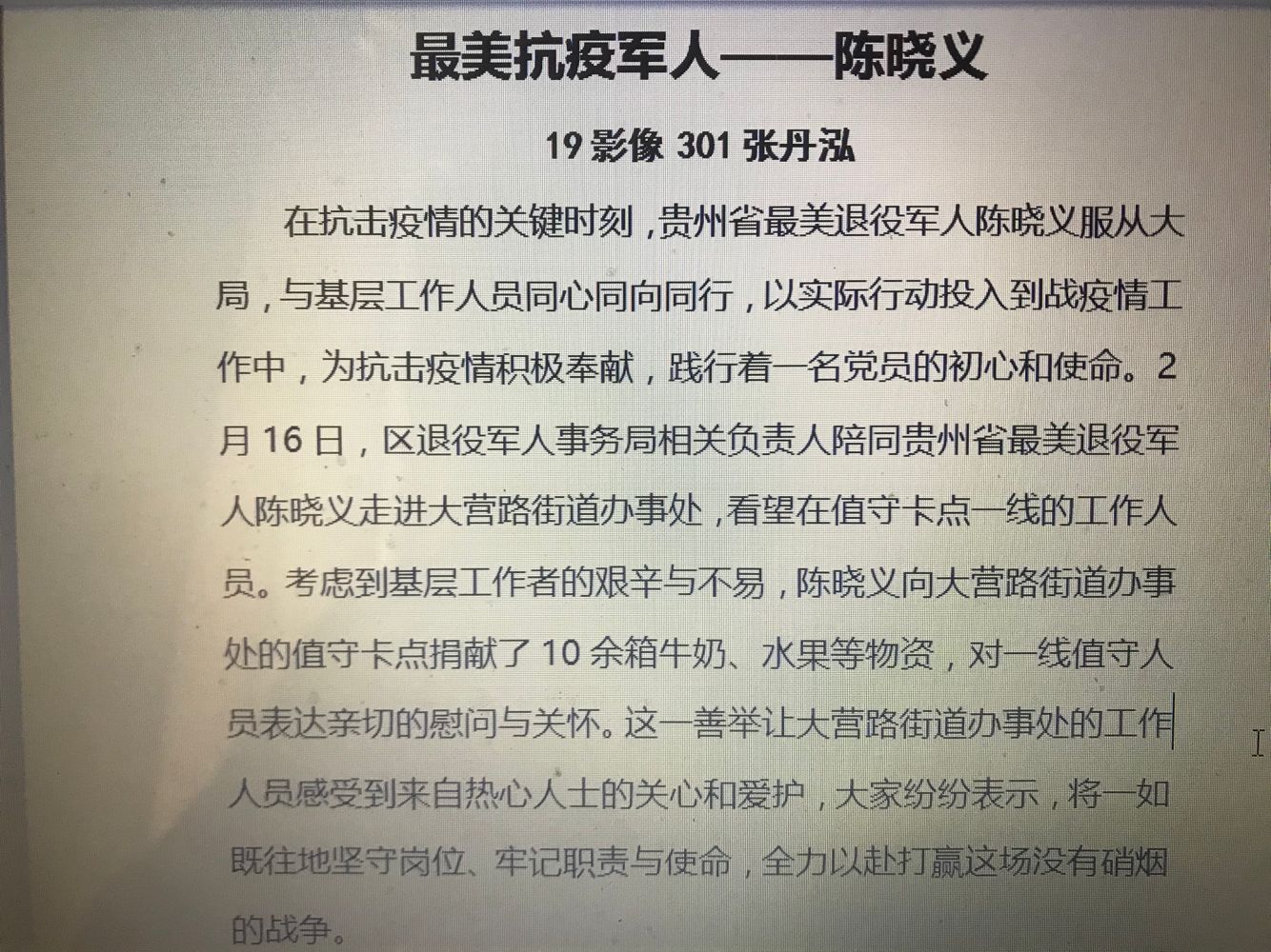 19護理301廖琳欣分享道:“當這場戰役的集結號吹響時,曾經的退役軍人也聞令而動,這是他們的本能,穿上軍裝,保家衛國;脫下軍裝,奉獻社會。這種本能來自于曾經的那身軍裝,來自于永遠不變的軍魂。”19影像301張丹泓寫道:“最美軍人陳曉義始終保持著軍人的特質,把榮譽、命令和責任牢記在心頭、扛在肩上,用愛心與善心助力抗擊新冠肺炎疫情,實實在在的貢獻著自己的力量,完成黨和人民賦予退役軍人的時代重任。”社員們積極尋找最美軍人事跡,表露自己最真實的心聲。