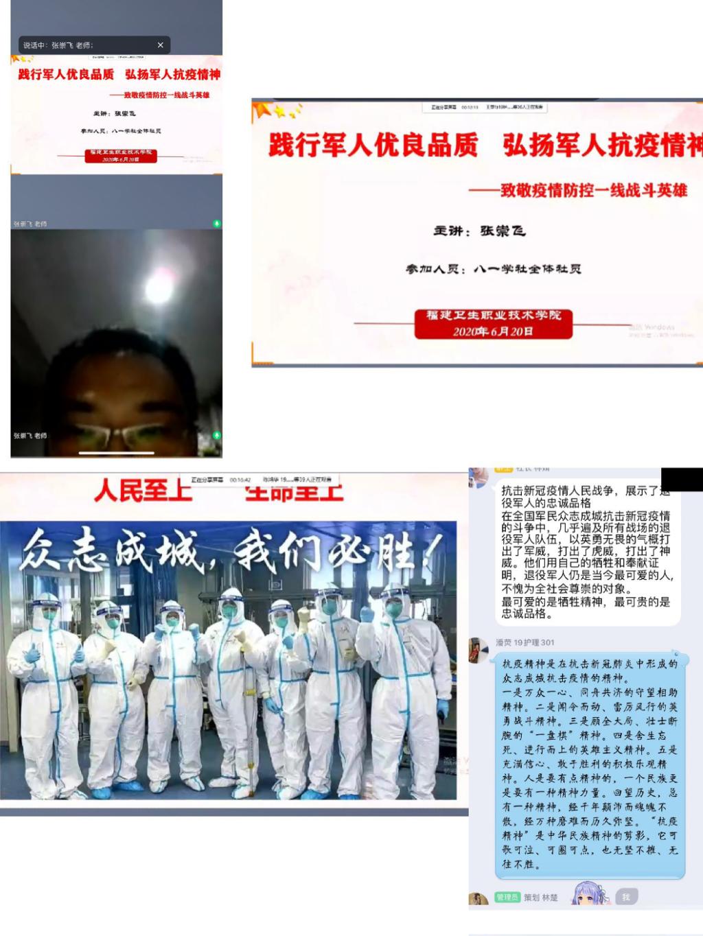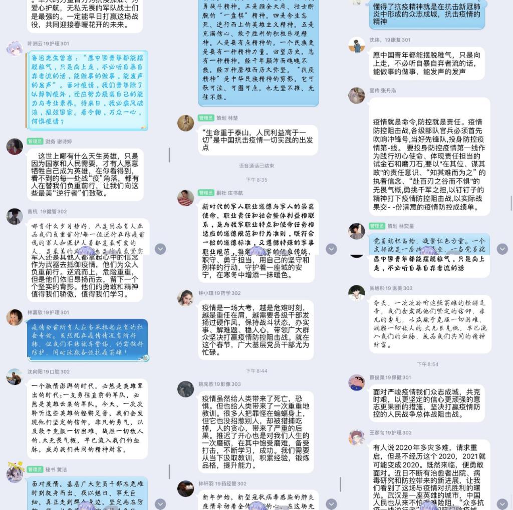 同學們在線上積極與老師頻繁互動,聽完講座每位社員都有很多感想。2019級保健301班蔡俊渠分享到:“面對嚴峻疫情我們眾志成城,共克時艱,以更堅定的信心更頑強的意志更果斷的措施,堅決打贏疫情防控的人民戰爭總體戰阻擊戰?!?019級醫學美容303班吳旭彤發表感想說:“今天,一次次聆聽這些英雄的鏗鏘足音,我們會發現他們堅定的信仰,非凡的勇氣,以及敢于克服一切困難、戰勝一切敵人的大無畏氣概,早已流入我們的血脈,成為我們共同的精神財富?!弊詈螅凇疤釤襞瘛钡母枨袌A滿結束了本次講座。